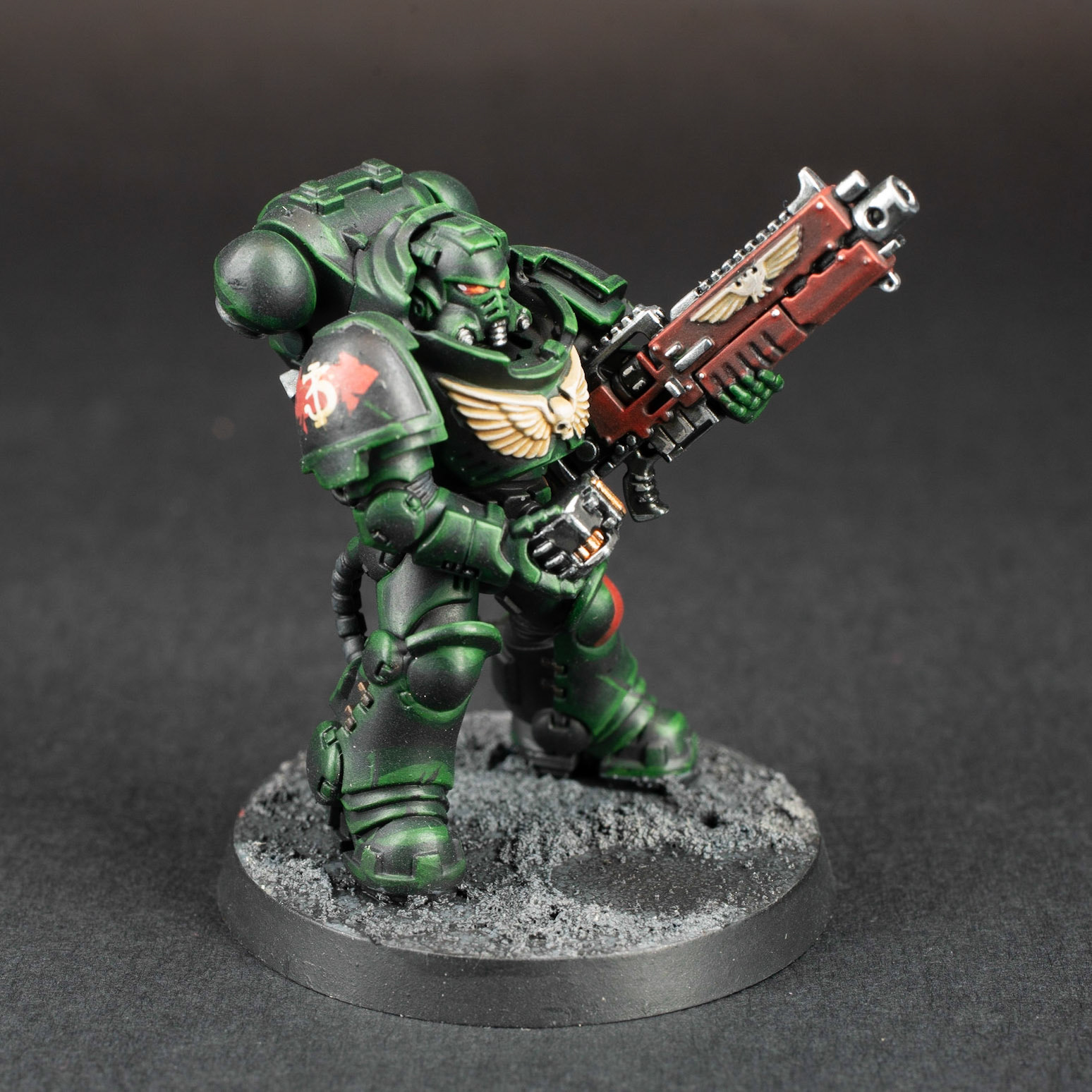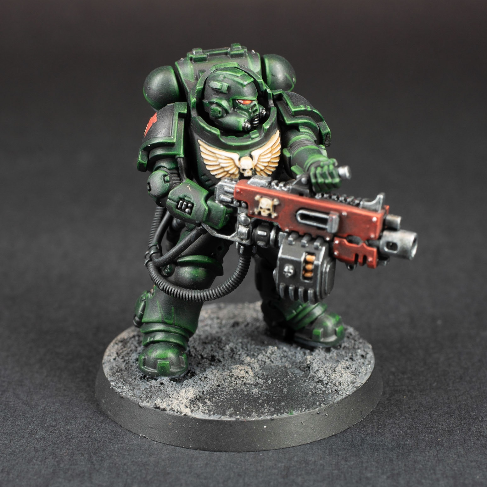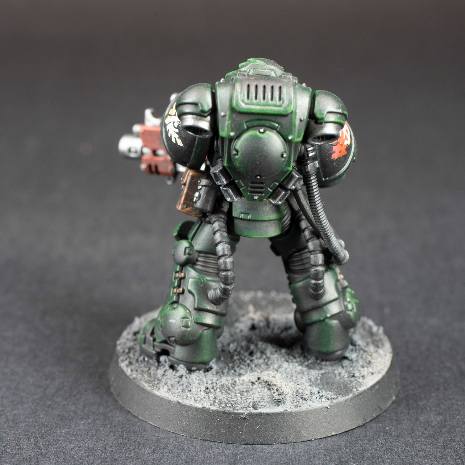 These are the first models for a Dark Angels army I'm starting, and a test of my color scheme. You often see them in a brighter green, but I wanted to go for a more dark, sinister look.