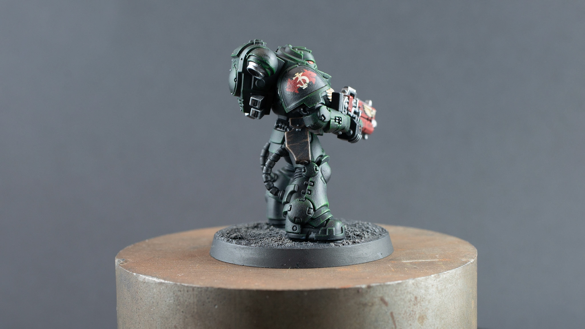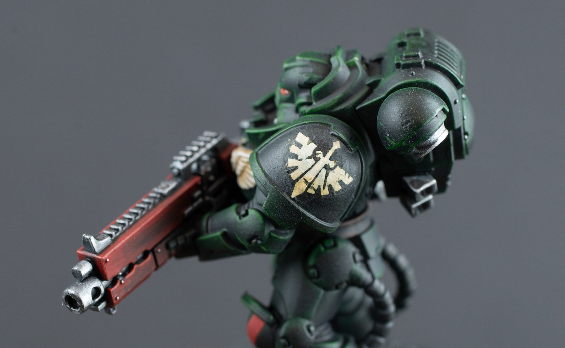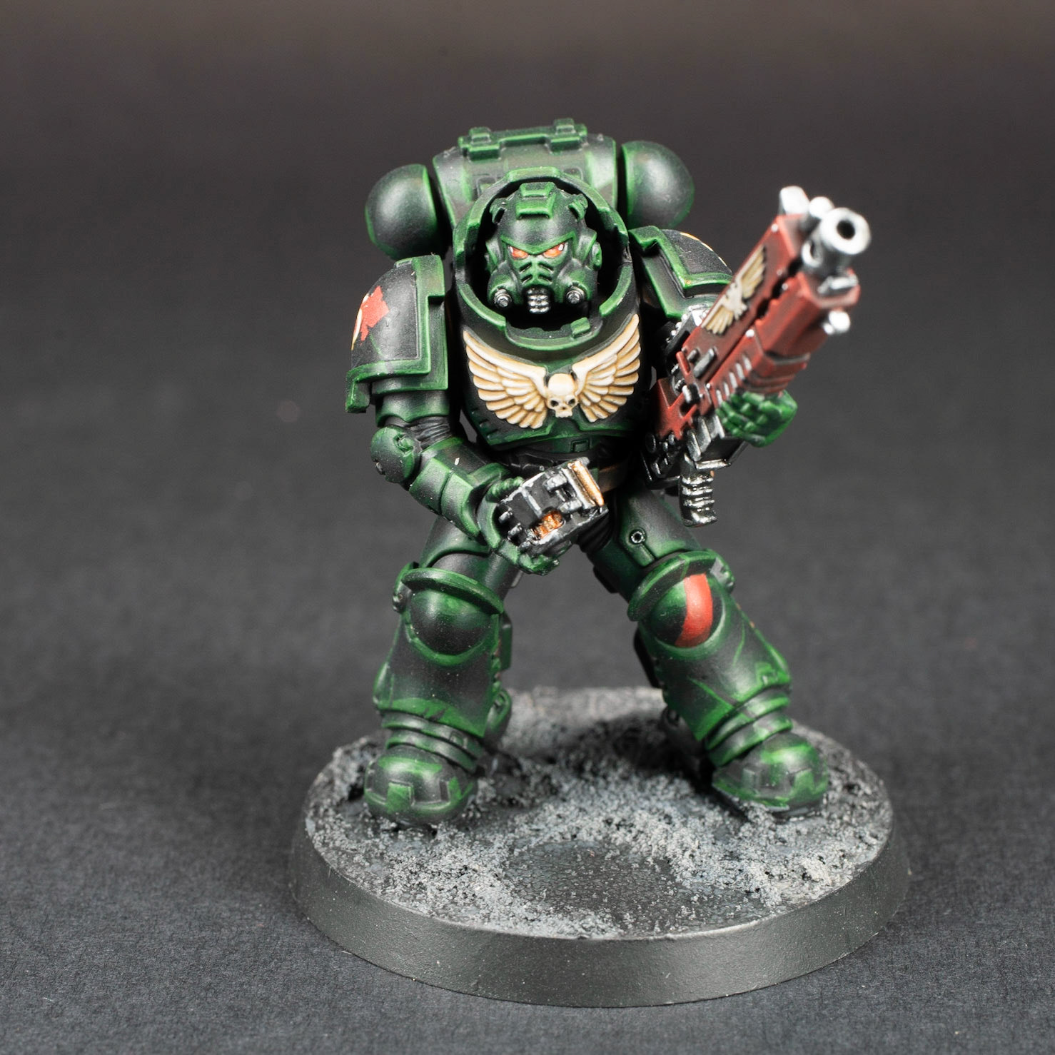 These are the first models for a Dark Angels army I'm starting, and a test of my color scheme. You often see them in a brighter green, but I wanted to go for a more dark, sinister look.